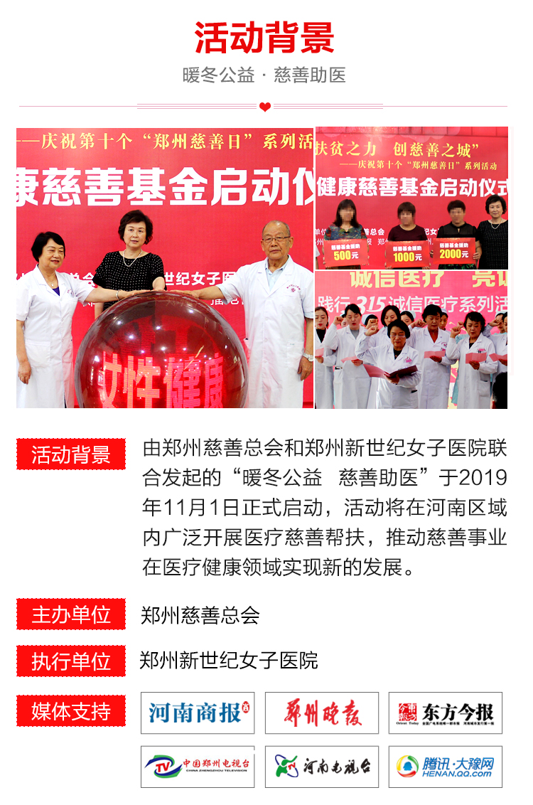 由郑州慈善总会和郑州新世纪女子医院联合发起的“暖冬公益 慈善助医”于2019年11月1日正式启动,活动将在河南区域内广泛开展医疗慈善帮扶,推动慈善事业在医疗健康领域实现新的发展:价值338元的妇科体检套餐仅需38元,彩超、阴道镜检查1折抢约,阴道护理限价50元/次,可尔依保宫无痛人流手术费480元,妇科整形手术费600-900元,石女再造手术费半价,宫外孕等妇科微创手术费半价,为河南女性健康保驾护航。