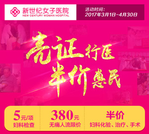 前言:周年院庆,感恩钜献。2017年3月1日-4月30日,郑州新世纪女子医院于浓情推出“亮证行医 半价惠民”活动,10元做妇检,380元做人流,妇科化验、治疗费、手术费半价等惠民活动,为河南女性健康保驾护航。
